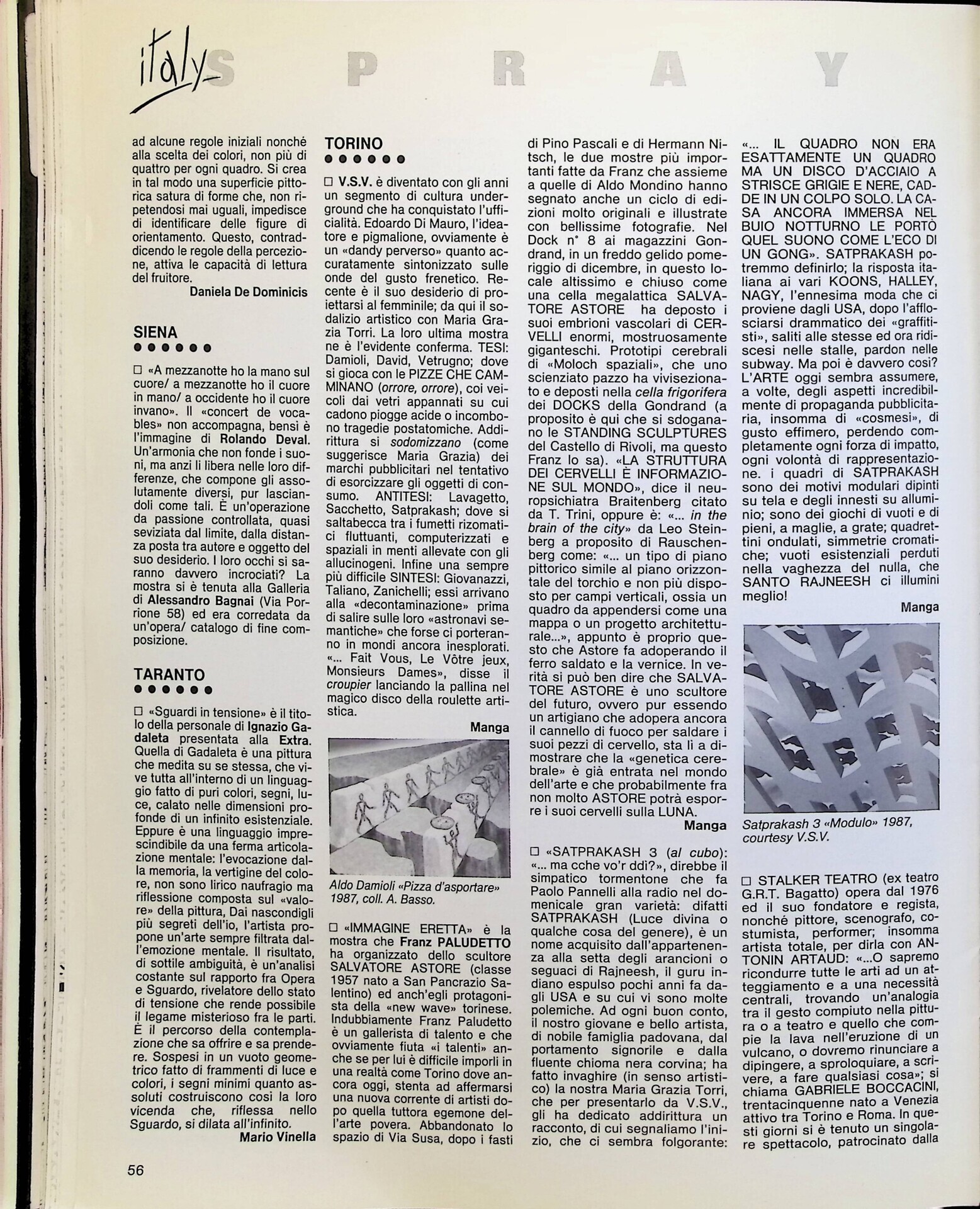 | Descrizione | Segnalazione della mostra alla V.S.V. di Torino di Satprakash 3, indicato come "artista padovano". Il termine Satprakash viene definito da Manga come "Luce divina o qualche cosa del genere" ed è "un nome acquisito dall'appartenenza alla setta degli arancioni o seguaci di Rajneesh, il guro indiano espulso pochi anni fa dagli USA e su cui vi sono molte polemiche". L'autore ironizza molto sulla scelta del nome dell'artista. |